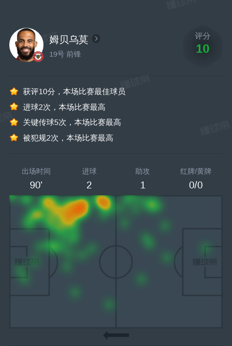 在北京时间1月4日的比赛中,南安普顿队迎战布伦特福德。姆贝乌莫成为当晚的绝对焦点,他在全场比赛中展现出了出色的表现。90分钟的出场时间里,姆贝乌莫打入了2球,完成1次助攻,5次关键传球和4次射门,展现出了极高的进攻效率。